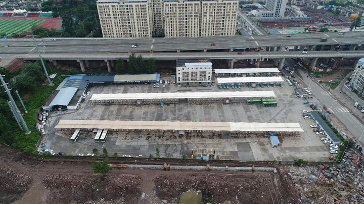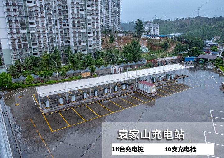 袁家山充电站:位于西昌市娇子路公交停车场内,总占地面积约12亩。装机容量2500千伏安,建有充电功率为120KW的直流充电桩18台,充电枪36支;