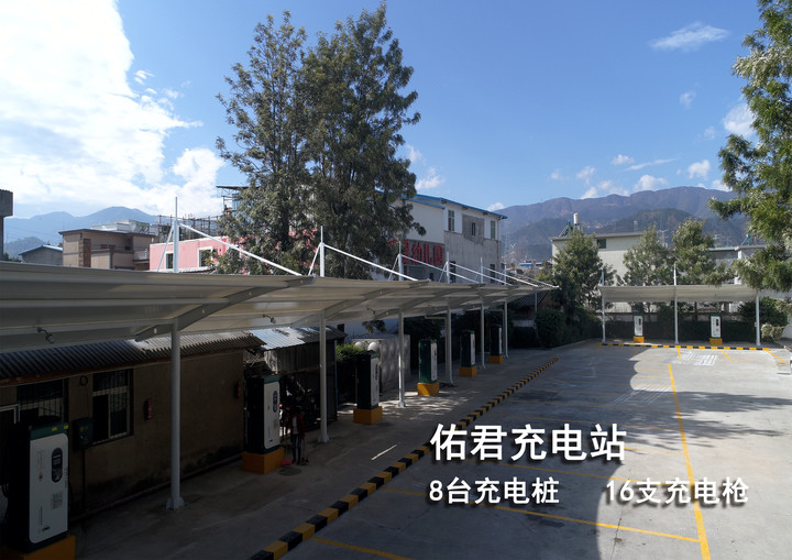 佑君充电站:位于佑君镇公交停车场内,装机容量1250千伏安,总占地面积约6亩。建有充电功率为120KW的直流充电桩8台,充电枪16支。