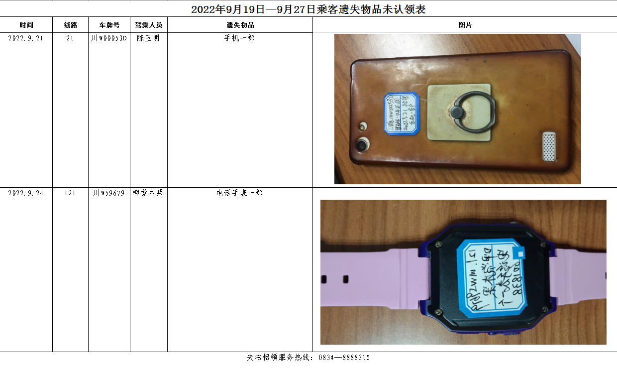 2022年9月19日—9月27日乘客遗失物品未认领表