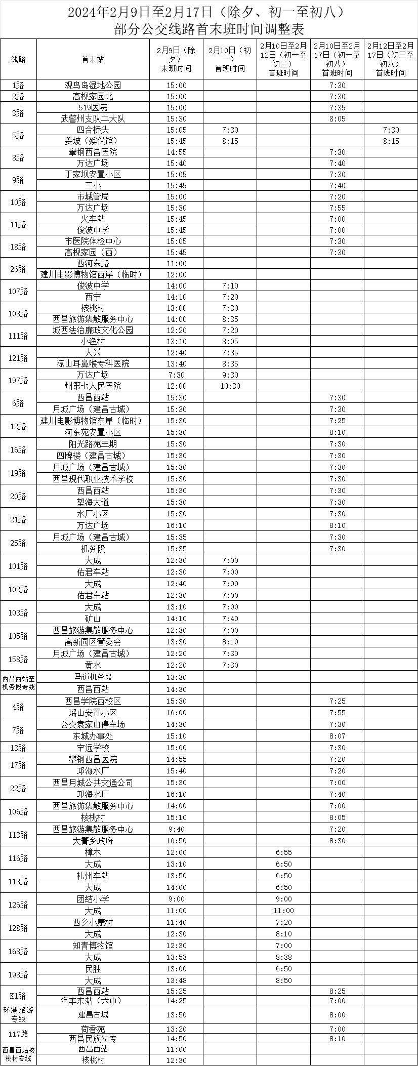 2024年除夕、初一至初八部分公交线路首末班时间有调整