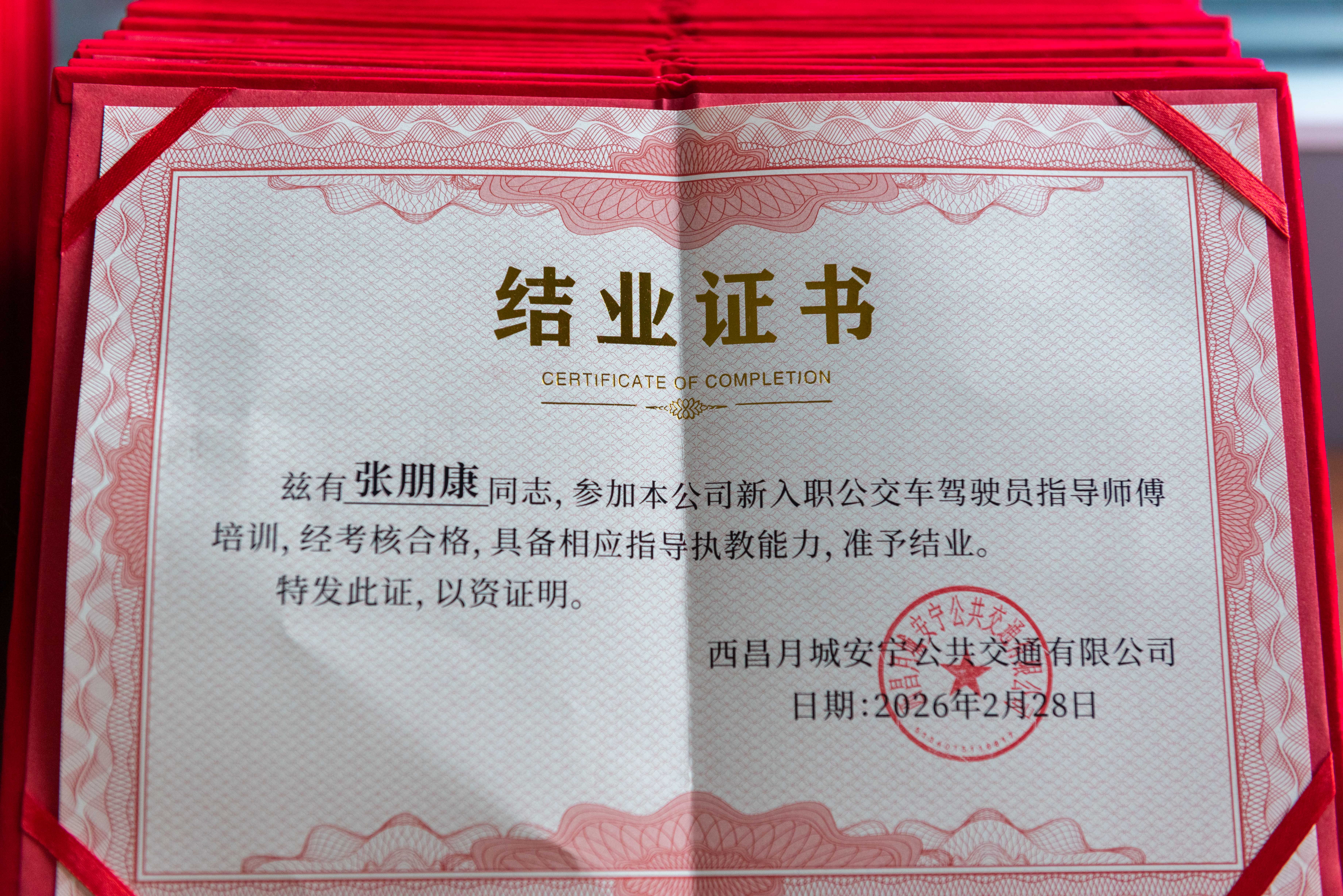 为强化职业驾驶员队伍建设,深化“师带徒”人才培养模式,筑牢公交运营安全防线,2026年3月6日上午,西昌月城安宁公共交通有限公司举行“匠心传承,安全护航”新入职驾驶员指导师傅聘书颁发仪式。通过“理论+实操”综合测评脱颖而出的42名公交驾驶员正式被聘任为新入职驾驶员的指导师傅。
