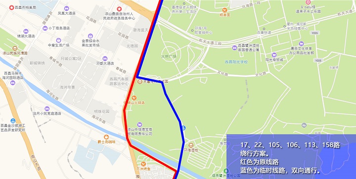 由于生态示范街建设,四公里半至刘家小桥路段进行改造,施工期间将进行全封闭式交通管制。为保障沿线人民群众出行需求,施工期间我司将临时调整以下线路: (一)17路、22路、105路、106路、113路、158路出城方向在西昌汽车旅游客运中心路口左转经民族大道右转进入观海路二段经望海路在州农业学校左转进入海滨中路。 (二)17路、22路、105路、106路、113路、158路进城方向在州农业学校右转经望海路左转进入观海路二段经民族大道进入三岔口南路。 由此带来的不便,敬请谅解!服务热线:0834—8888315
