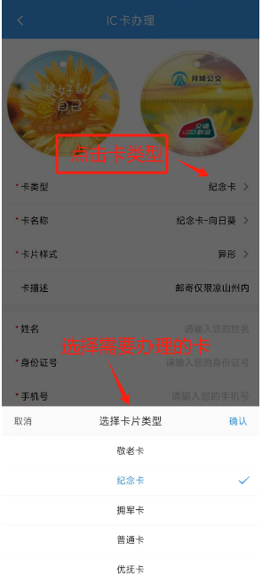 一、各类公交卡线上申领:“IC卡办理”1、支持各类公交卡线上申领,点击“卡类型”-根据需求选择需要办理的卡并确认(纪念卡可在“卡名称”中选择不同卡面);