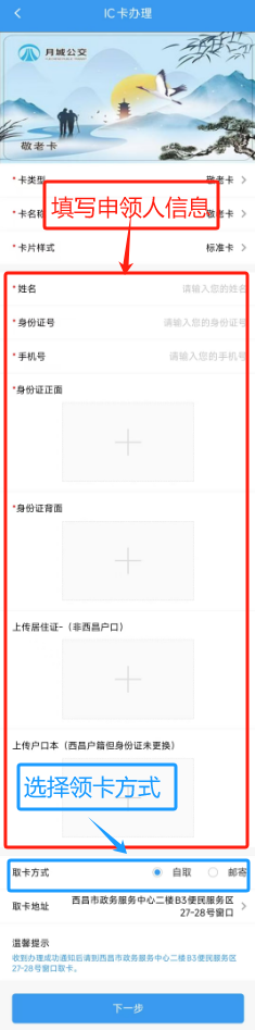 2、根据提示填写申领人信息并上传资料图片-选择领卡方式-点击“下一步”;