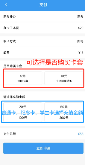 3、根据需求选择卡套(普通卡、纪念卡、学生卡可选择充值金额)-点击“立即申请”-完成支付;