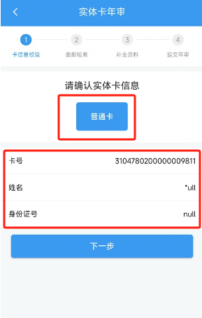 1、输入实体卡号后点击“查询”,进入实体卡确认页面-核对卡片信息无误后-点击“下一步”-完成“人像匹配”-根据提示上传资料-等待后台审核。