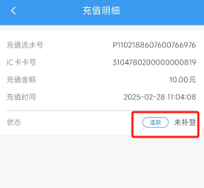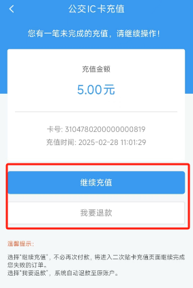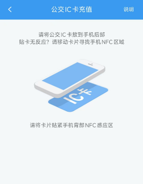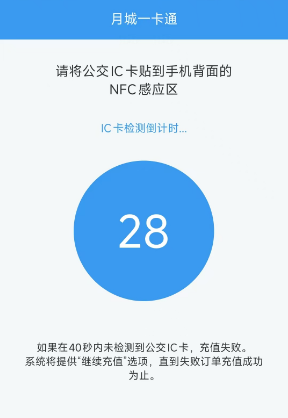充值失败可在读卡页面,将公交卡贴在手机背面NFC感应区域-页面跳转后点击“继续充值”或“我要退款”