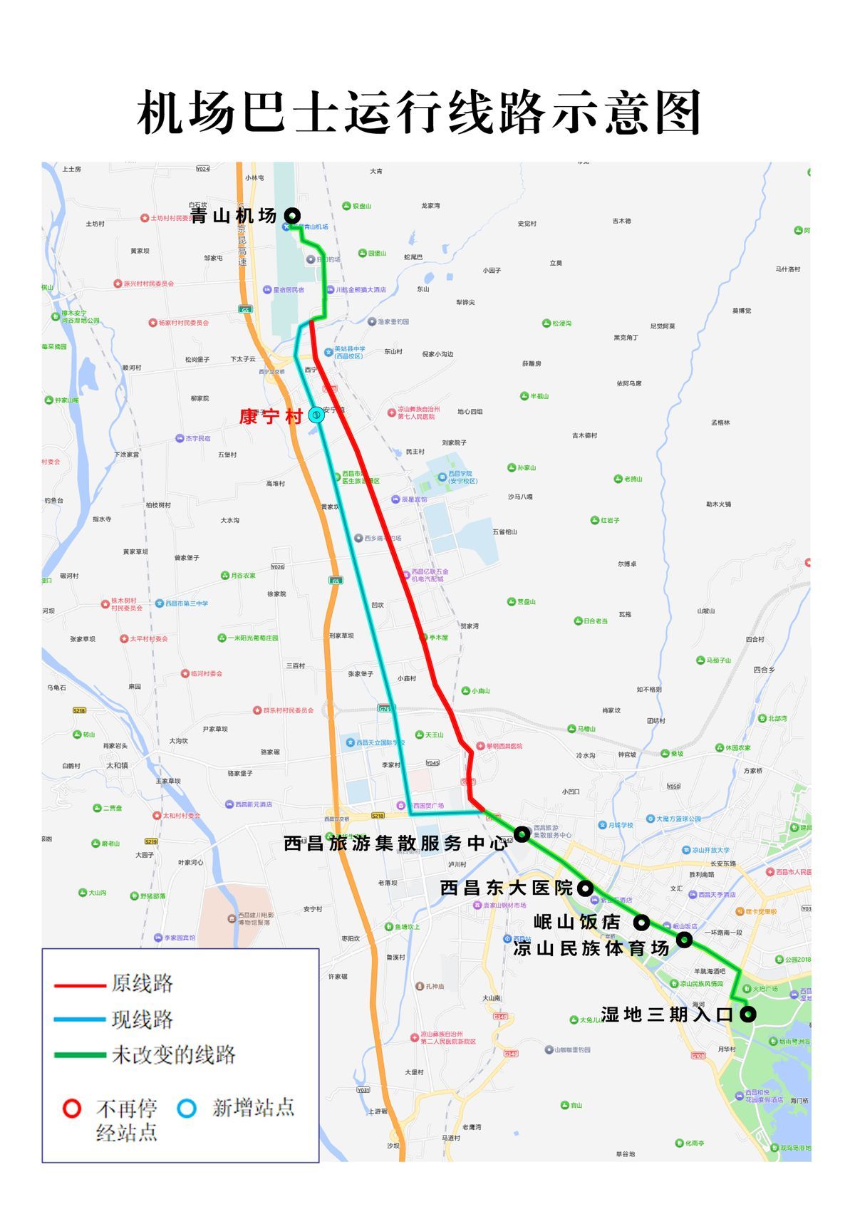 停靠站点为:青山机场、康宁村、西昌旅游集散服务中心、西昌东大医院(原名仁酒店)、岷山饭店、凉山民族体育场、湿地三期入口。
