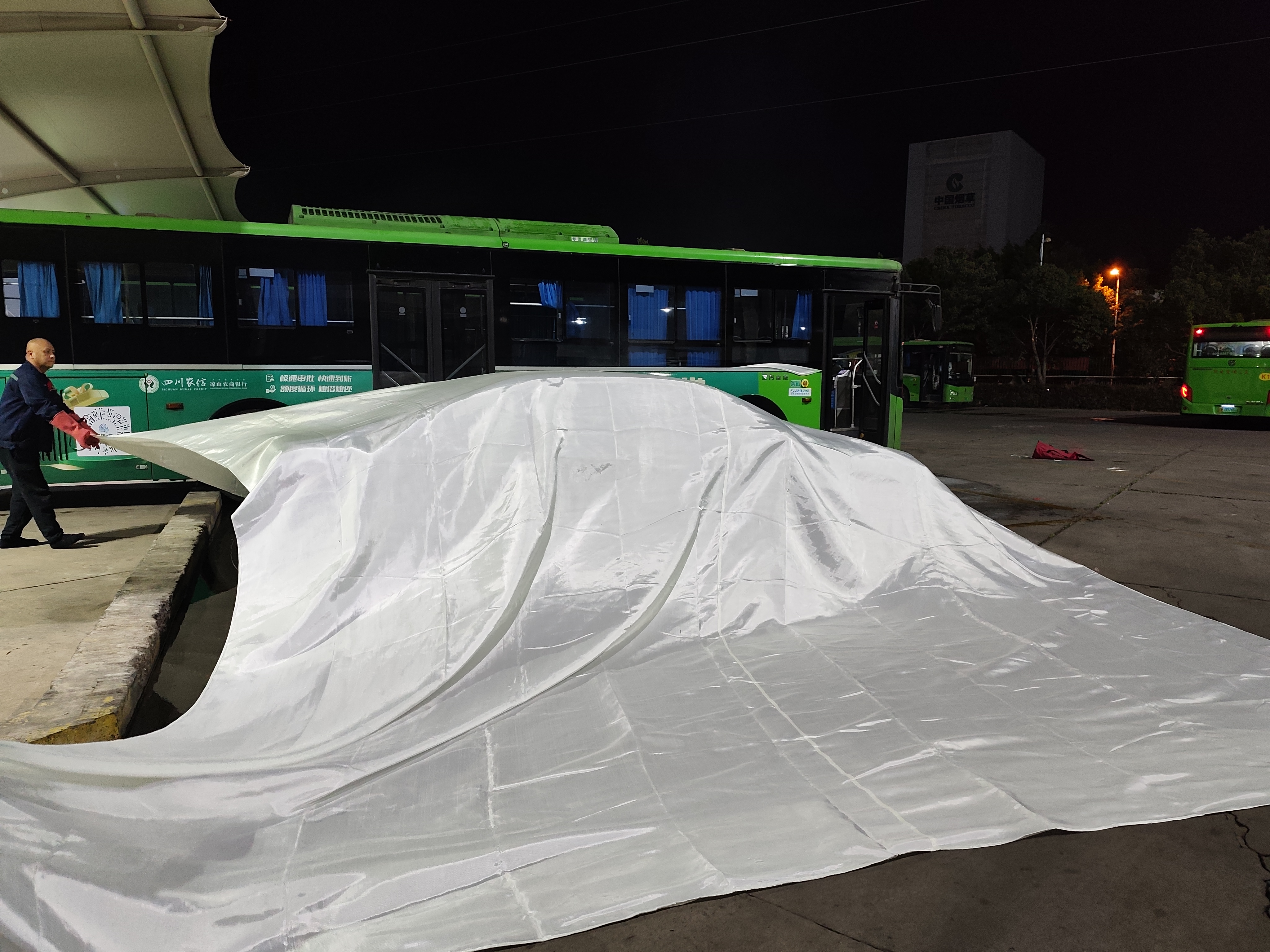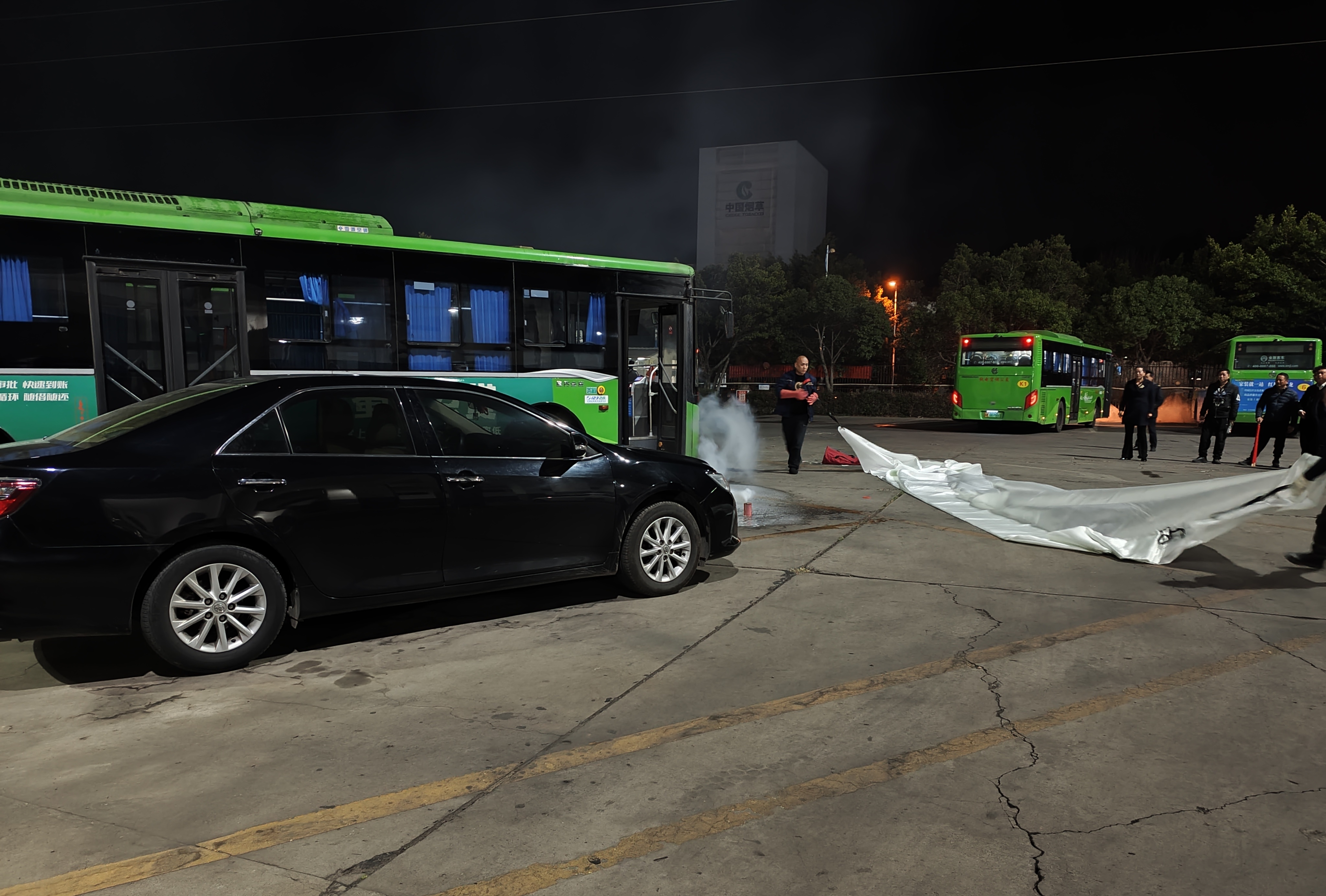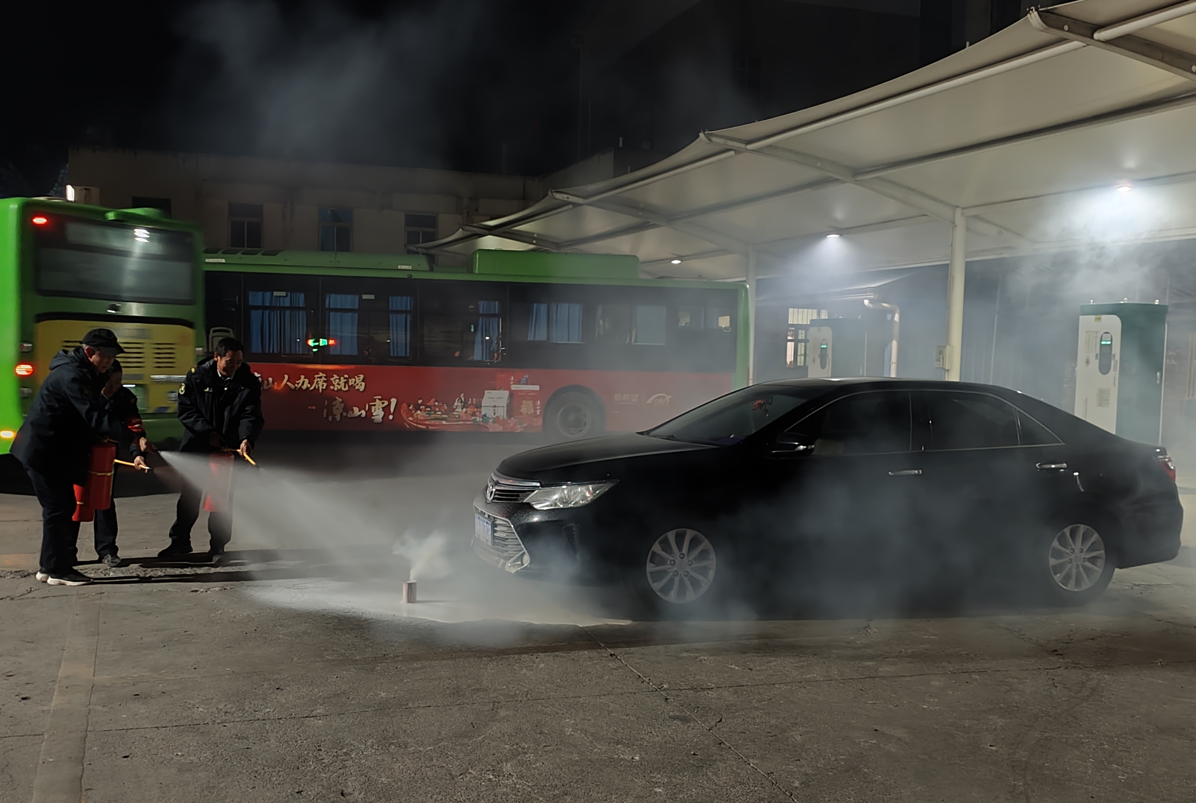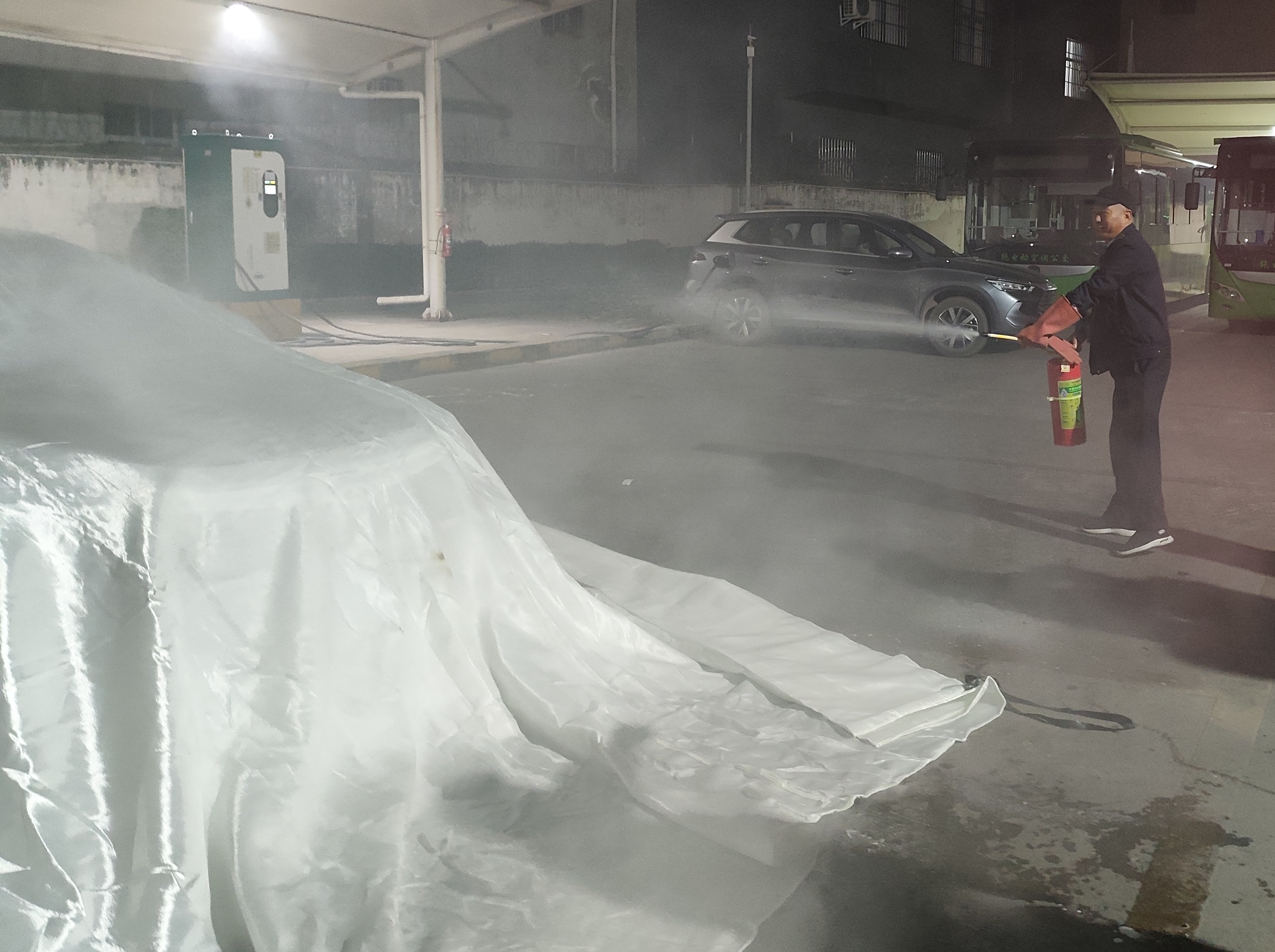 演练模拟夜间充电车辆突发火情场景,涵盖从发现火情、报警呼救、切断电源、疏散车辆到初期火灾扑救的全流程处置。参与演练的场站值班人员、保安、充电工及驻站驾驶员迅速响应、配合默契,尤其在“初期火势未有效控制”的情景下,现场人员果断使用车用灭火毯对起火车辆进行覆盖隔离,有效延缓火势蔓延,为专业消防救援争取宝贵时间。