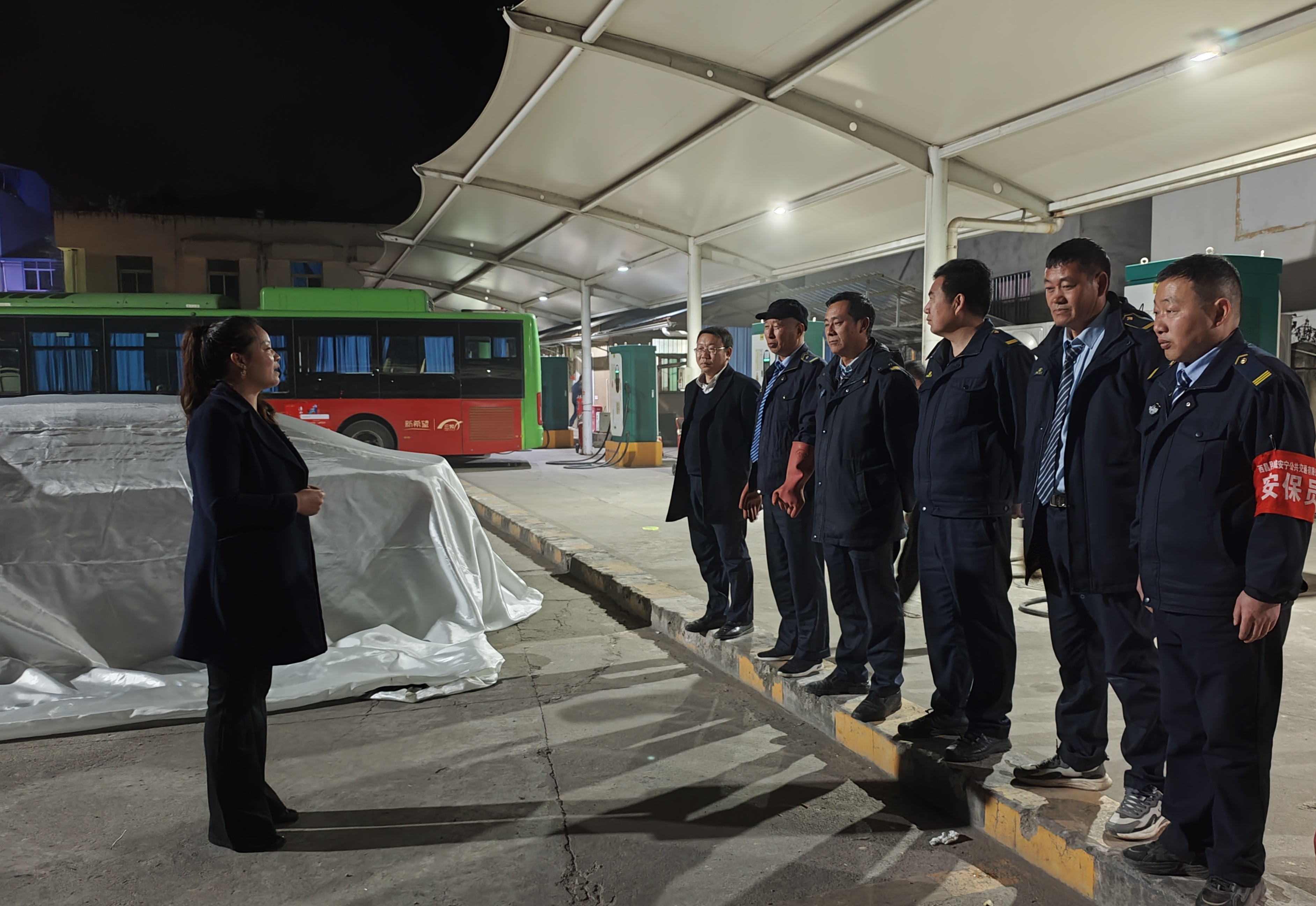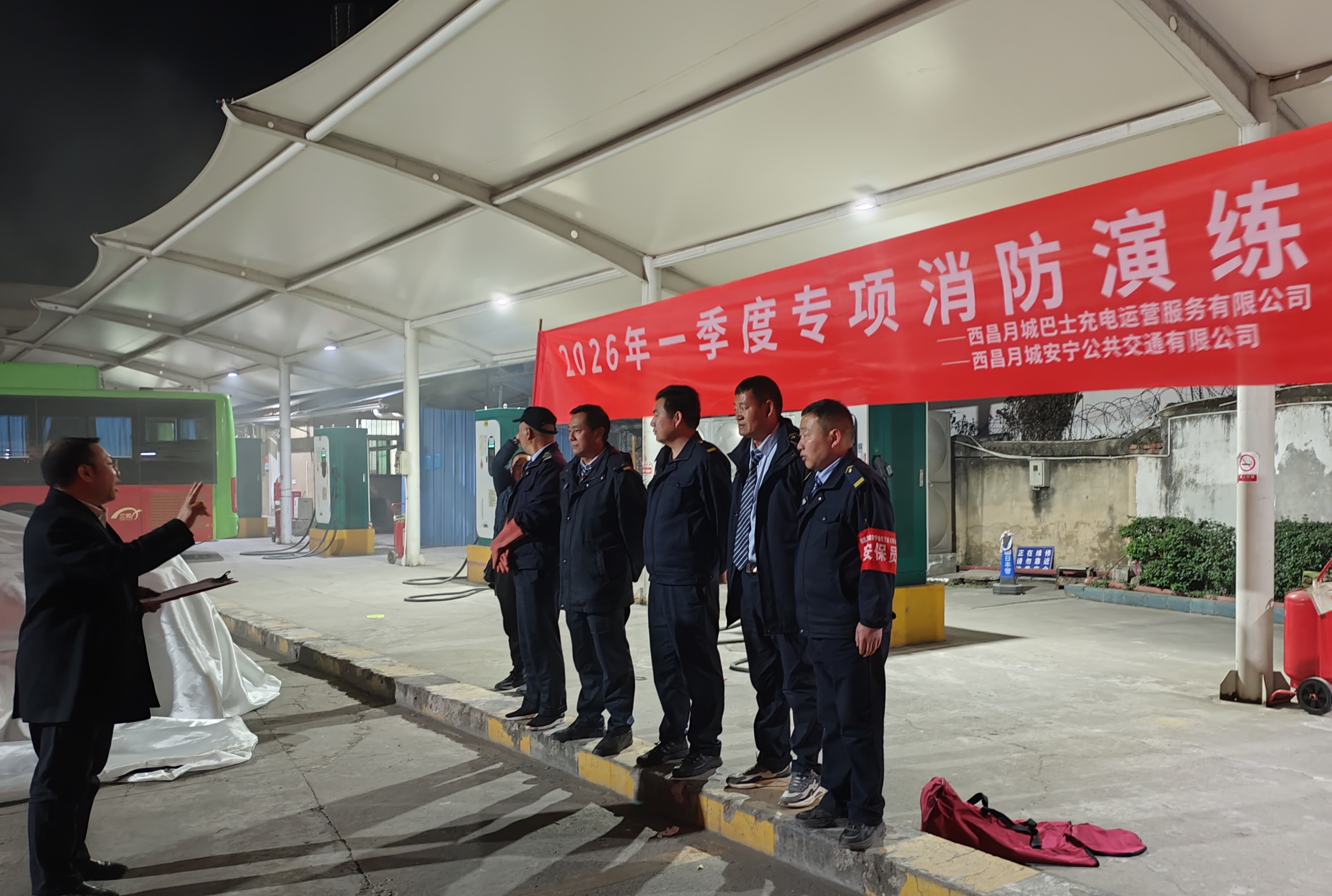 为全面提升各充电场站夜间消防安全应急能力,保障冬季及春节期间场站安全稳定运行,2026年1月28日至29日,西昌月城巴士充电运营服务有限公司联合西昌月城安宁公共交通有限公司组织开展了多场次夜间消防应急演练,覆盖河西、西客站、袁家山、礼州、城北、川兴等六大场站。此次演练重点检验夜间突发火情下各岗位人员的协同处置能力,并强化新配备的消防器材——车用灭火毯的操作技能,进一步提升初期火灾扑救效能。