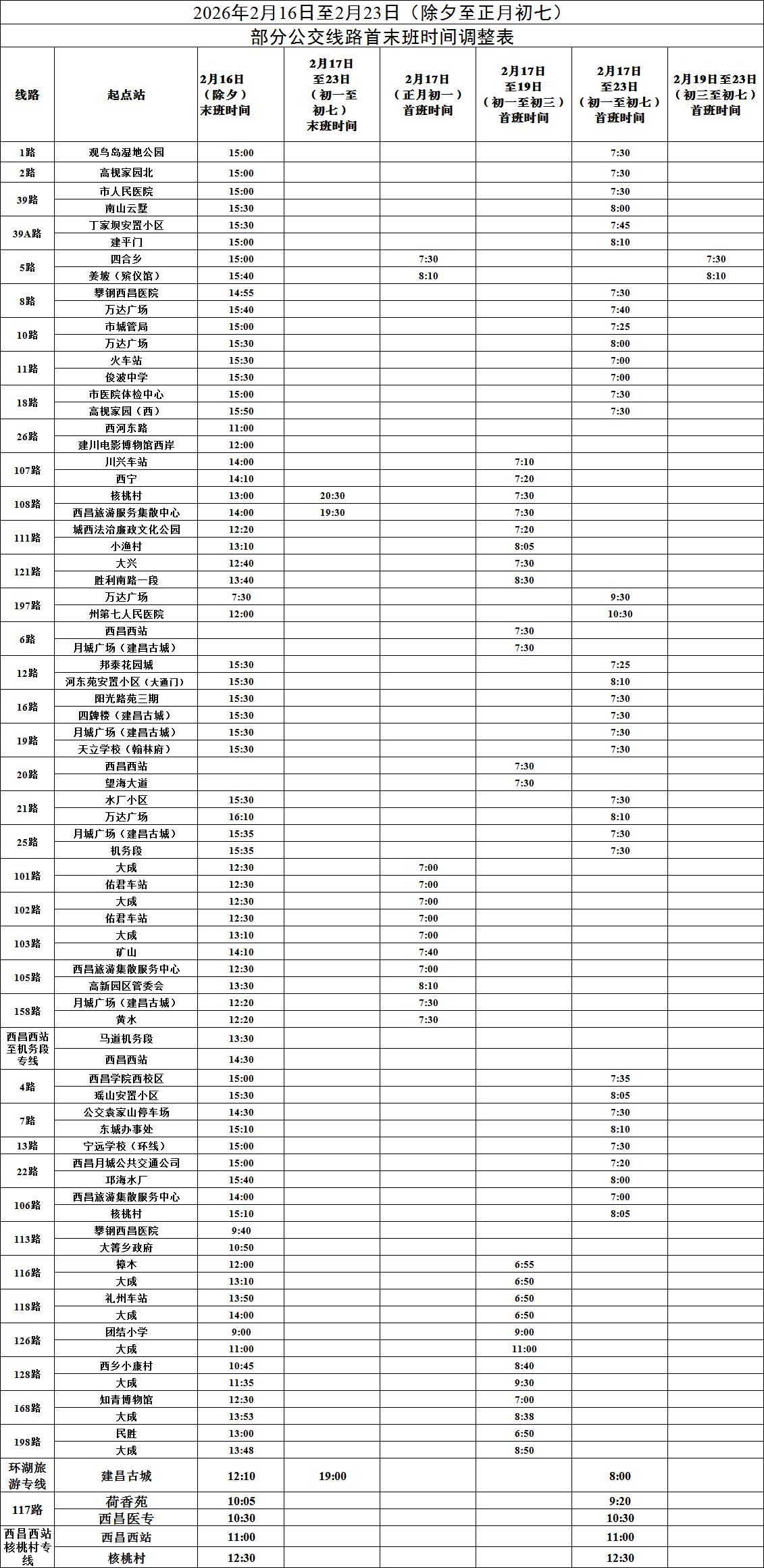 西昌月城安宁公共交通有限公司 2026年2月16日至2月23日(除夕至正月初七)部分公交线路首末班时间调整的通告